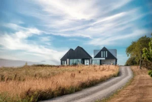 The exterior of the home is long and linear, and comprised of ACM panels, a simple brick and a killer wood siding profile from Newtech Wood siding.