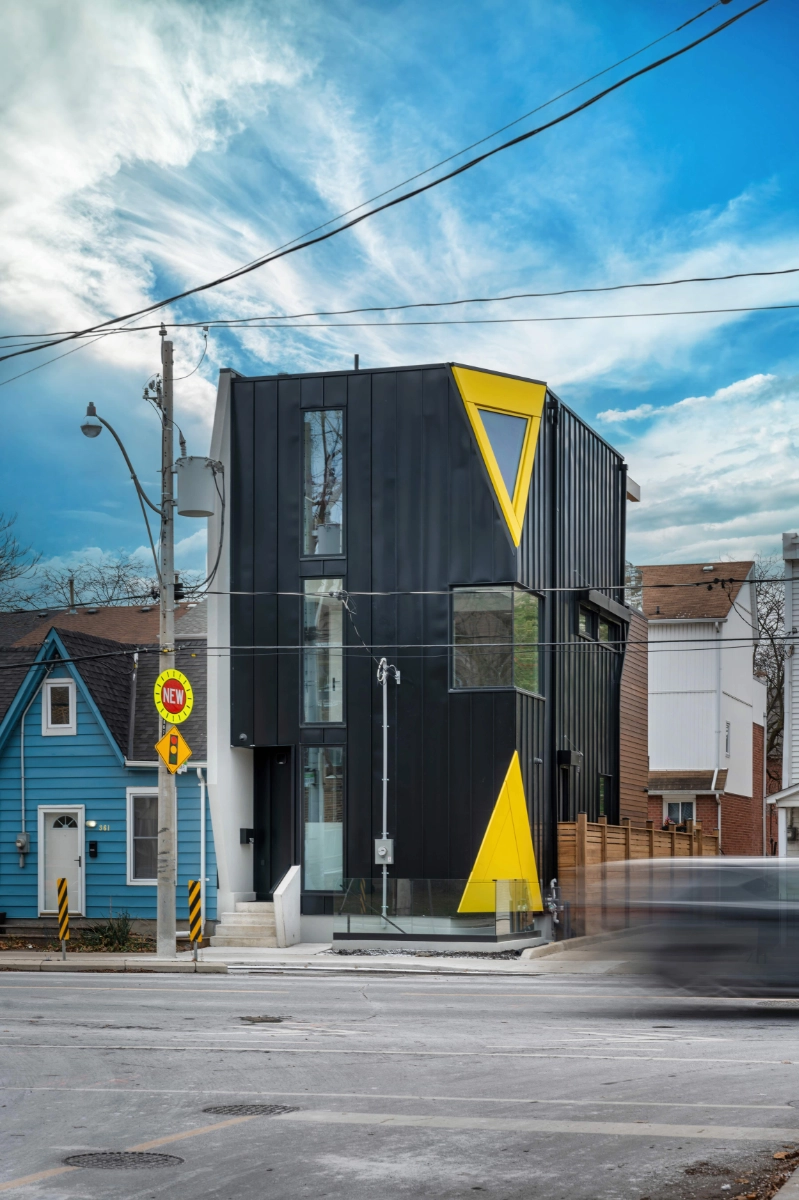 From the street, the home stands out immediately: a striking composition of sharp forms, deep charcoal cladding, warm wood accents, and a vivid yellow feature that slices through the façade. It’s a home that doesn’t just sit on the street—it energizes it.