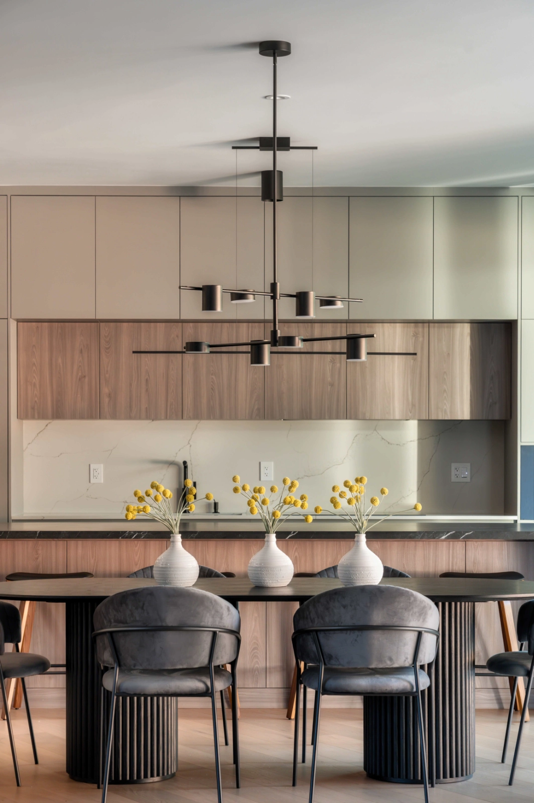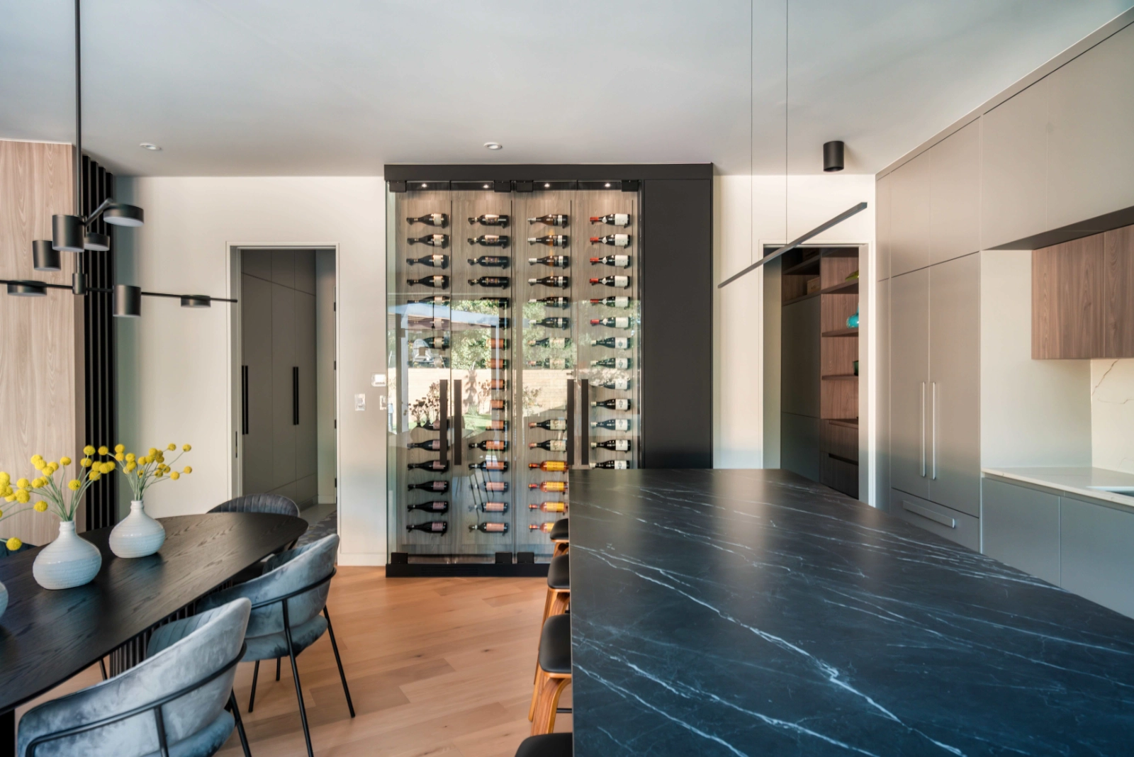 The kitchen and dining area serve as the heart of the home—both functional and sculptural. Custom millwork, integrated appliances, and a dramatic stone island balance elegance with everyday usability. A temperature-controlled glass wine display acts as a focal point, blending storage with visual interest.