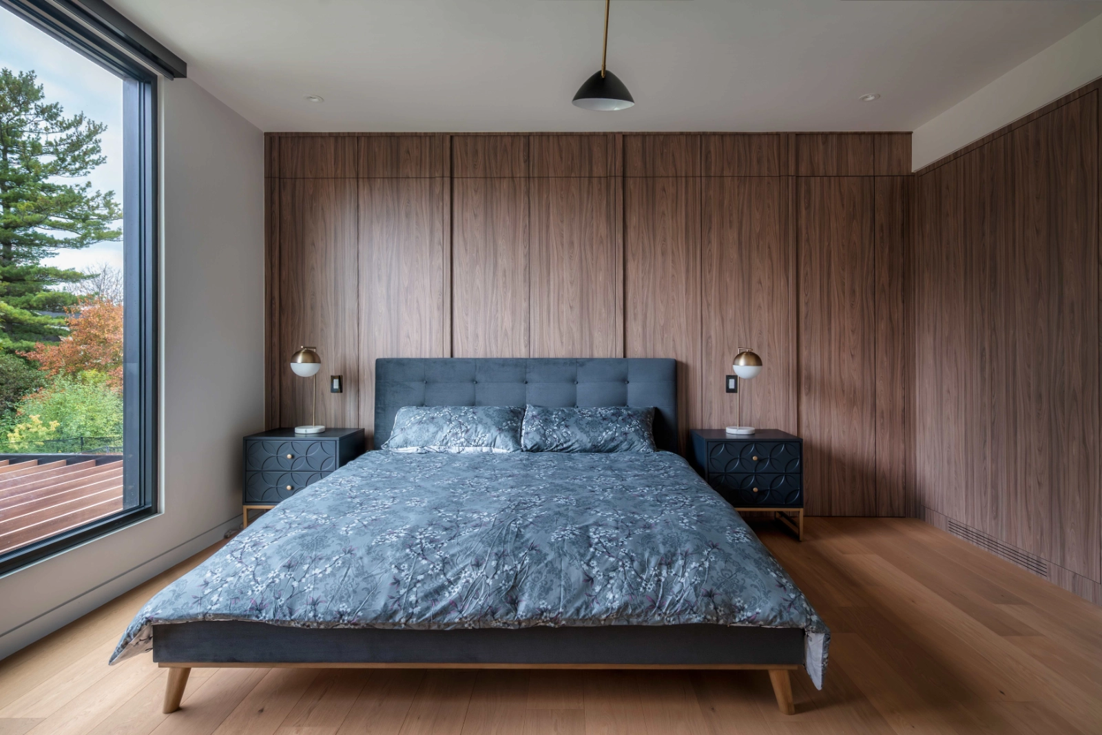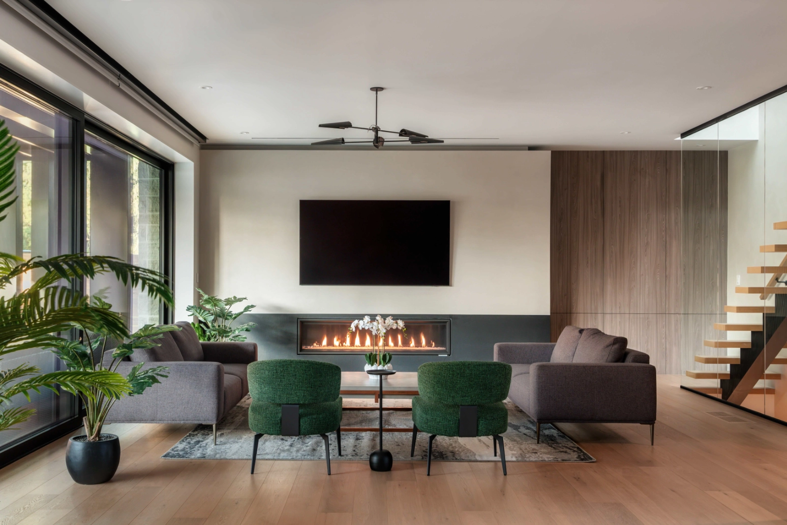 The living space is anchored by a linear fireplace and framed by expansive glazing, reinforcing the home’s connection to nature. Thoughtful lighting design—combining fixtures with subtle ambient sources—enhances the atmosphere throughout the day and evening.