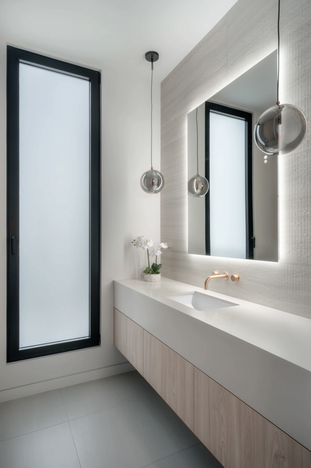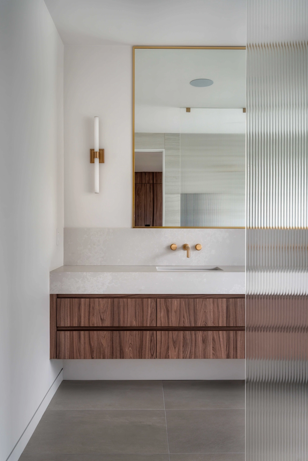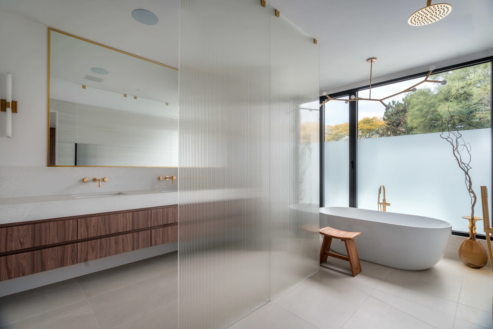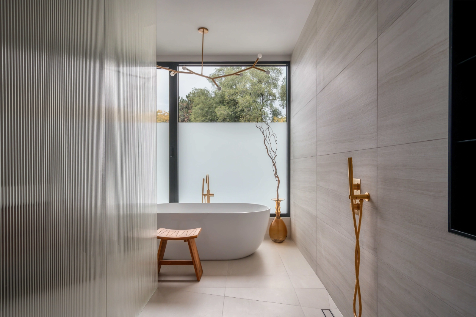 Bathrooms and private spaces are designed as spa-like environments. Soft stone surfaces, custom vanities, and refined brass accents create a calm, restorative experience. Frosted and textured glass elements provide privacy while preserving light and openness.