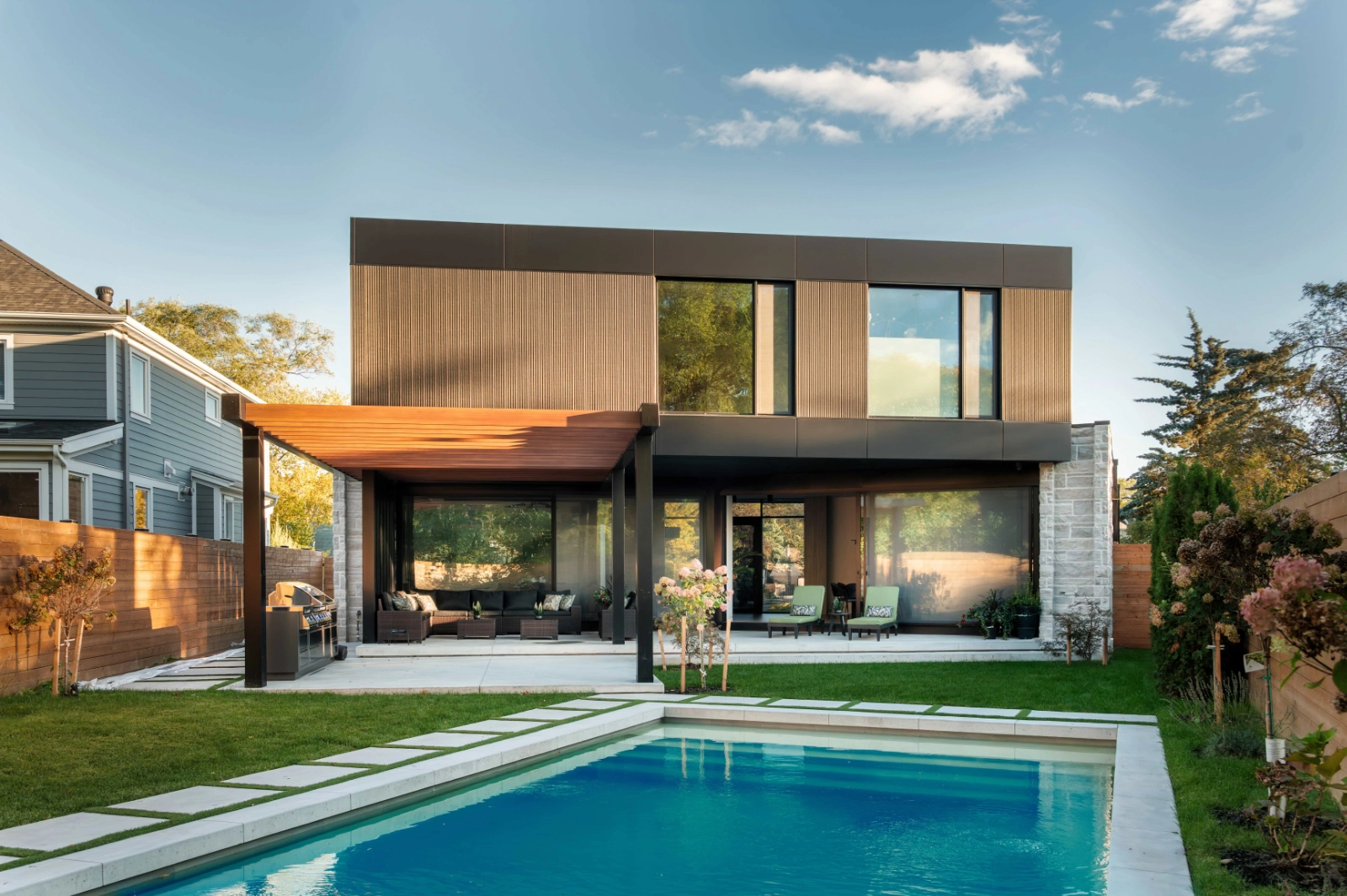 The exterior composition is defined by strong horizontal volumes layered with rhythmically placed masonry fins. These stone elements anchor the home to the site, offering privacy and depth, while the upper-level volume—wrapped in dark vertical cladding—appears to float above. Generous glazing is strategically positioned to frame views, draw in natural light, and maintain a refined street presence. The rear façade opens fully to the landscape, transforming the home into an inward-looking retreat. Large sliding glass walls dissolve the boundary between indoors and outdoors, creating a seamless connection to the backyard, pool, and covered terrace.
